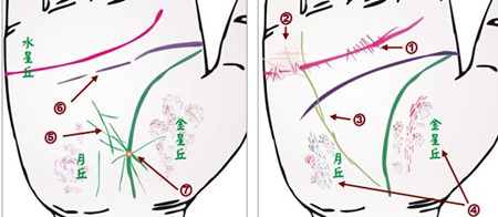 生命线始端分岔,常见于孩童时代脑疾患。有副生命线,这因身体麻痹,多用手动作而起的。中风及脑肿瘤的人也常见。月丘靠手腕处肌肉绷紧隆起,是用手而肌肉发达现象。掌中央十字,表示依托宗教信仰来解病困